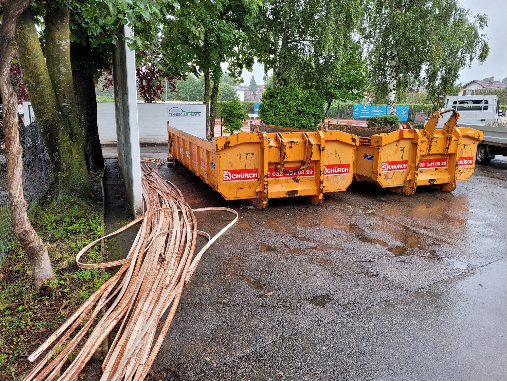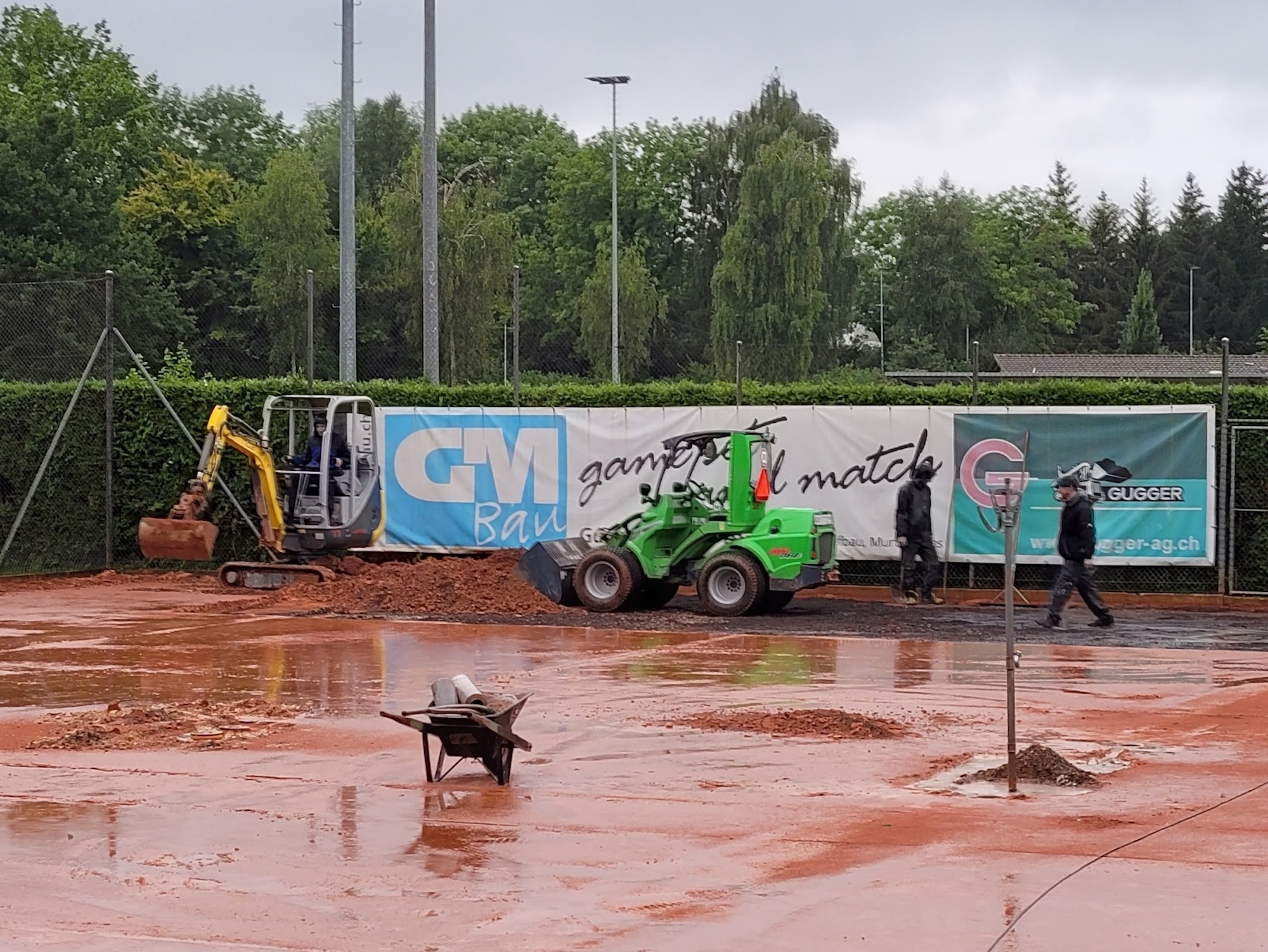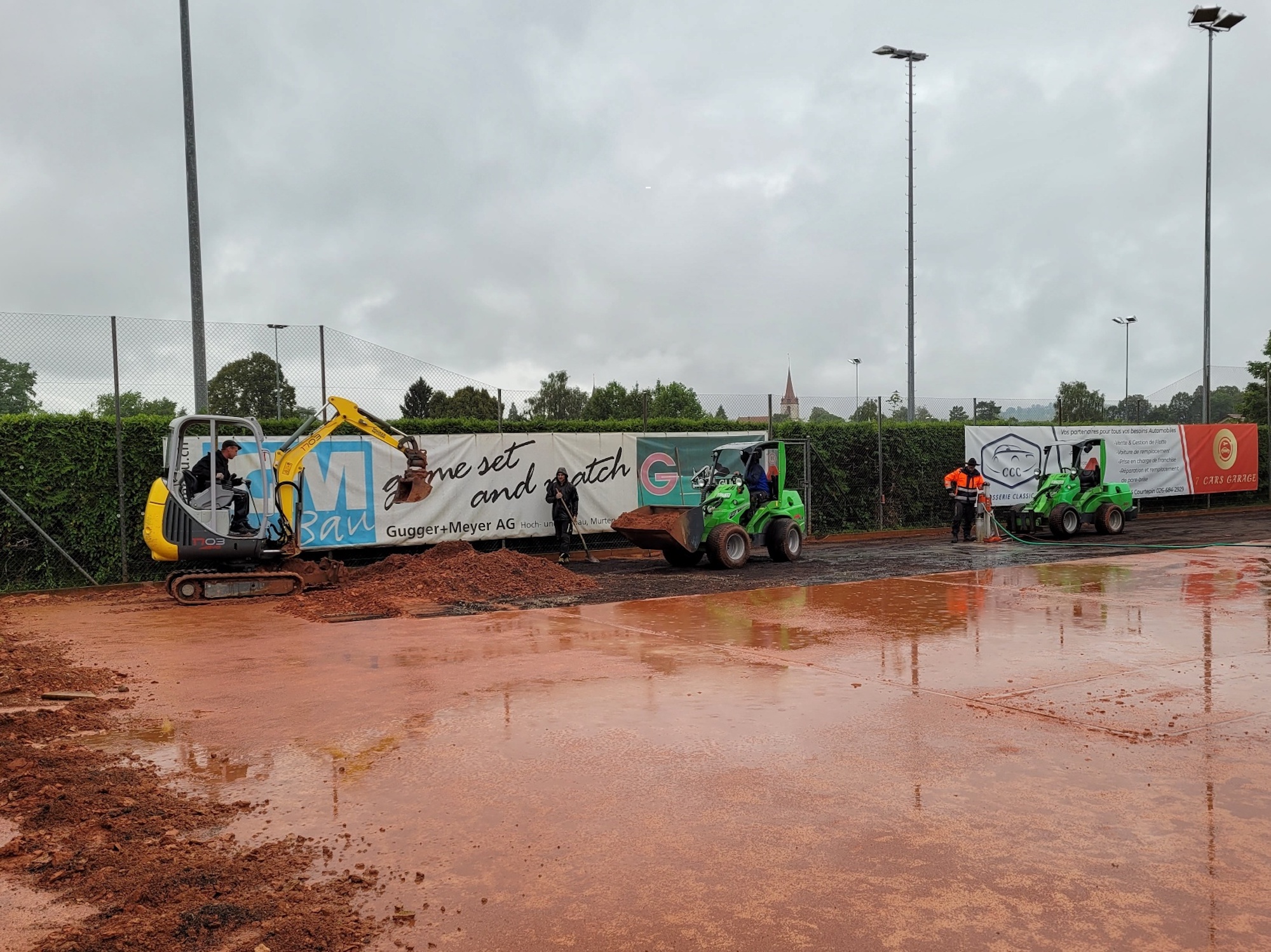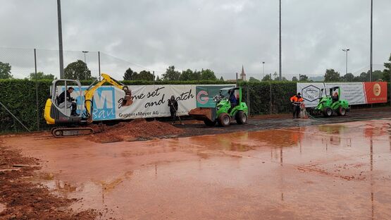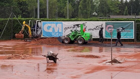 Wer Tennis spielt, kennt es: Man ist abhängig vom Wetter. So konnte gerade in den letzten Wochen sehr wenig gespielt werden, da die Sandplätze bei starkem Regen nicht bespielbar sind. Auch im Winter müssen diese geschlossen werden. Diesem Problem möchte der Tennisclub Murten, der in den letzten zwei Jahren viele neue Mitglieder gewonnen hat, nun entgegenwirken. Am Mittwoch ist deshalb die Firma Joseph Tennisplatzbau extra aus Graubünden angereist und hat mit den Bauarbeiten begonnen. Aus den Sandplätzen eins und zwei, die direkt vor dem Clubhaus liegen, sollen zwei Allwetterplätze werden. Die Mitglieder des Clubs freuen sich bereits, bei (fast) jeder Witterung Tennis spielen zu können.