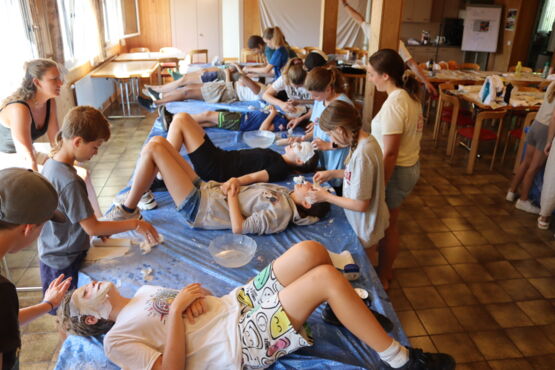 Der Morgen startete mit Rührei zum Zmorge. Danach wurden wunderschöne Gipsmasken gebastelt, T-Shirt’s bemalt und Tiermasken auf Gesichter gezeichnet. Alle hatten grossen Spass. Zur Stärkung gab es Würste frisch vom Grill, bis es mit dem Nachmittagsprogramm weiterging. Es wurden Masken dekoriert und Räuber und Bulle gespielt, wobei die Leiter trotz kleinen Verlusten den Sieg davontrugen.