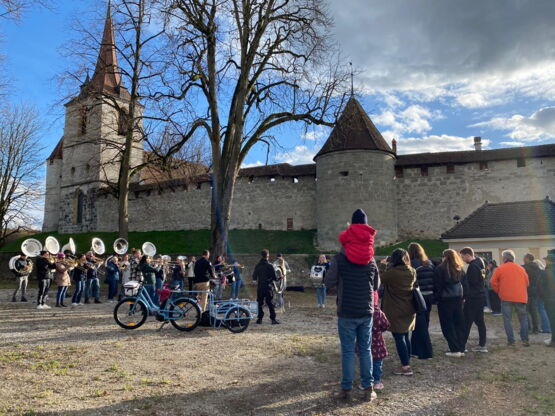 Zwar ist die Fastnacht schon seit drei Wochen vorbei. Und auch der Narrentempel, der dort während dieser Zeit jeweils zum Fastnachtstanz einlädt, ist auch schon abgebaut. Doch nach der Fastnacht ist ja bekanntlich vor der Fastnacht. Das mögen sich auch die Gugger der Göggimöffe-Zunft Murten gesagt haben, die zu einer öffentlichen Probe mit anschliessendem Apèro einluden. Dies mit dem Ziel, neue Mitglieder:innen, «die Lust auf Guggenmusik haben», zu gewinnen. Selbst Musikant:innen, die noch kein Instrument spielten, seien willkommen.