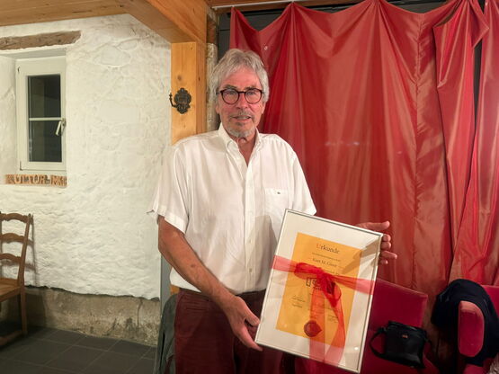 Stephan Hugentobler überreicht Kurt Gloor die Urkunde für seine riesengrosse Arbeit in unserem Kulturhaus in Murten.