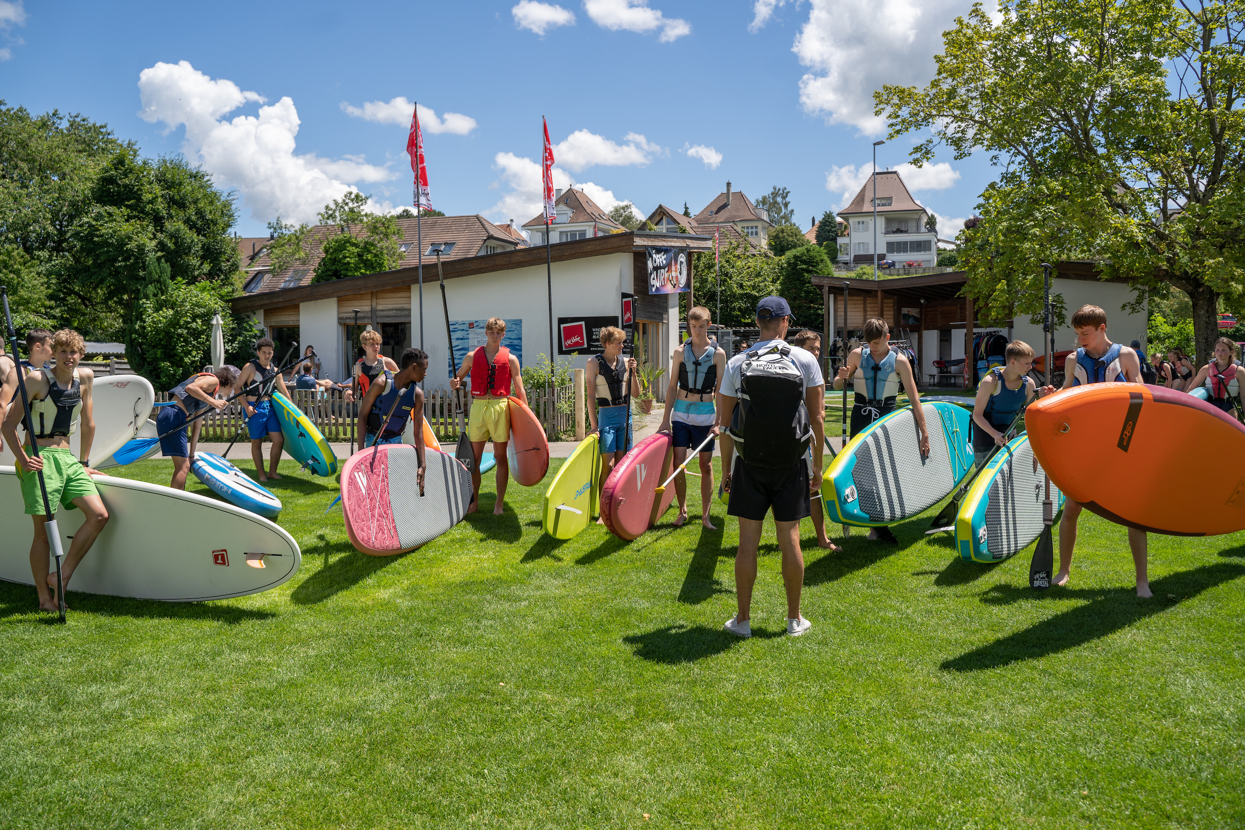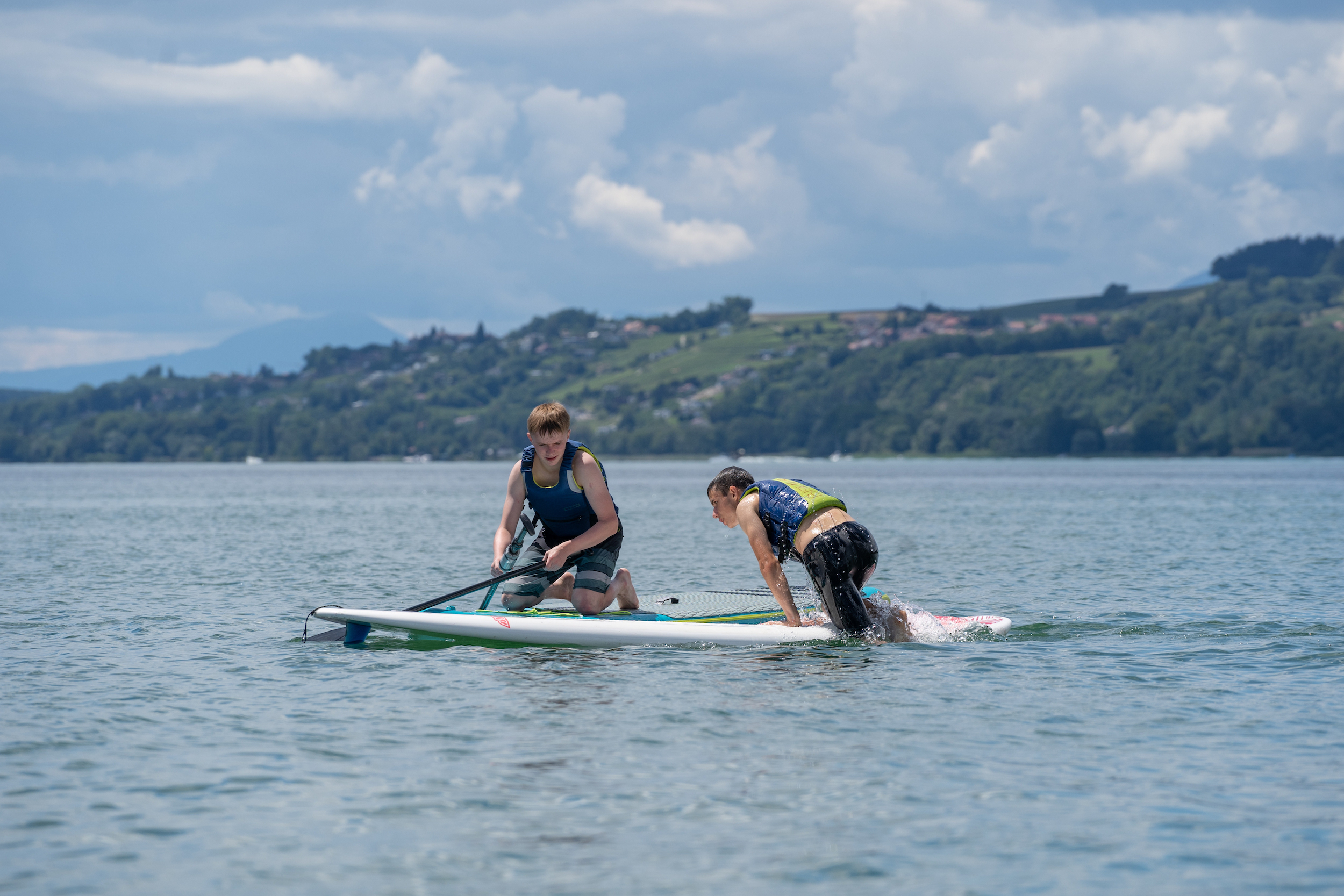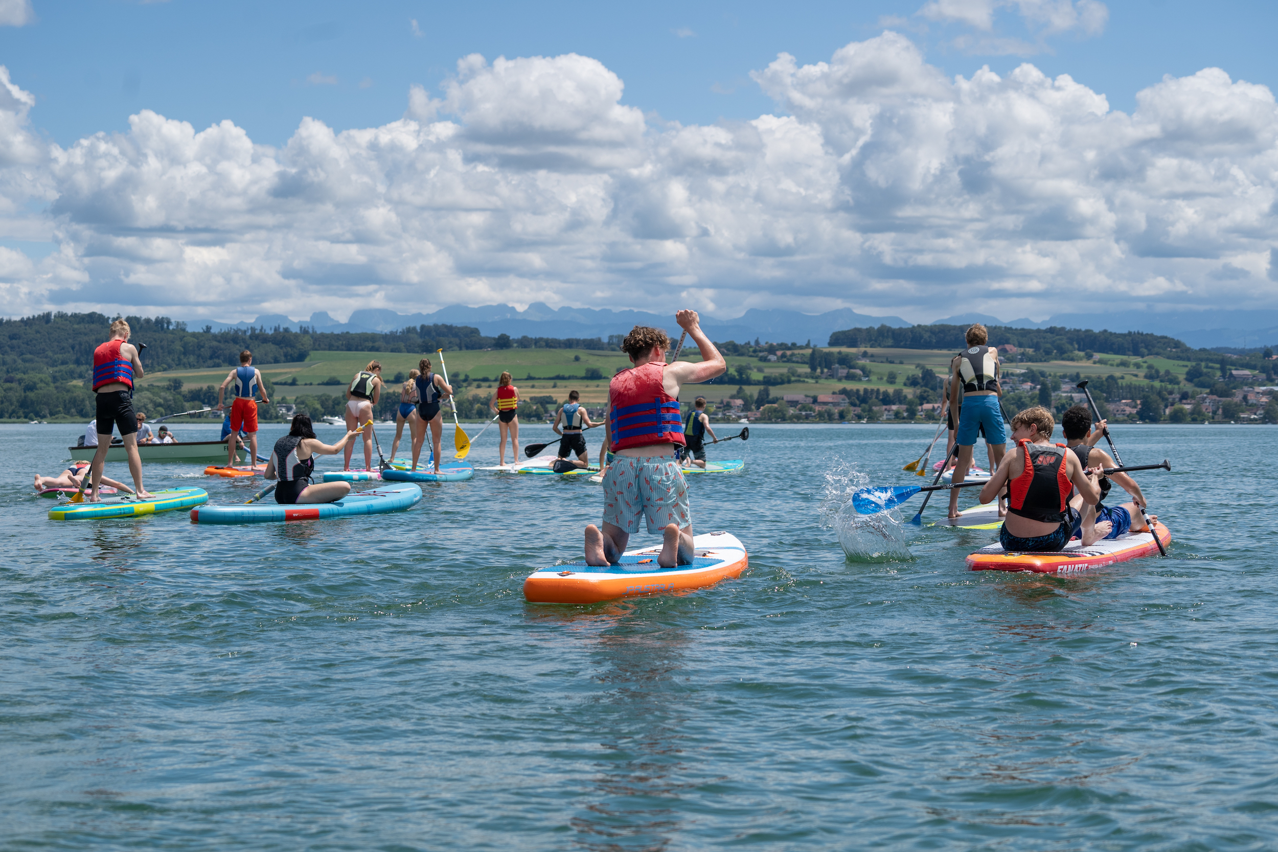 Nach dem gemeinsamen Mittagessen marschierten die Teilnehmer zur Pantschau, wo Stand-Up-Paddles auf sie warteten. Die nächste Herausforderung bestand darin, gemeinsam innerhalb von 90 Minuten übers Wasser in Nant und wieder zurück zu sein. Die Jugendlichen schafften dies in 88 Minuten. Zur Sicherheit wurden sie von zwei Begleitbooten flankiert. Als Belohnung durften Sie einen Scheck im Wert von CHF 1000 an eine Organisation ihrer Wahl spenden. Gewählt wurde der WWF.