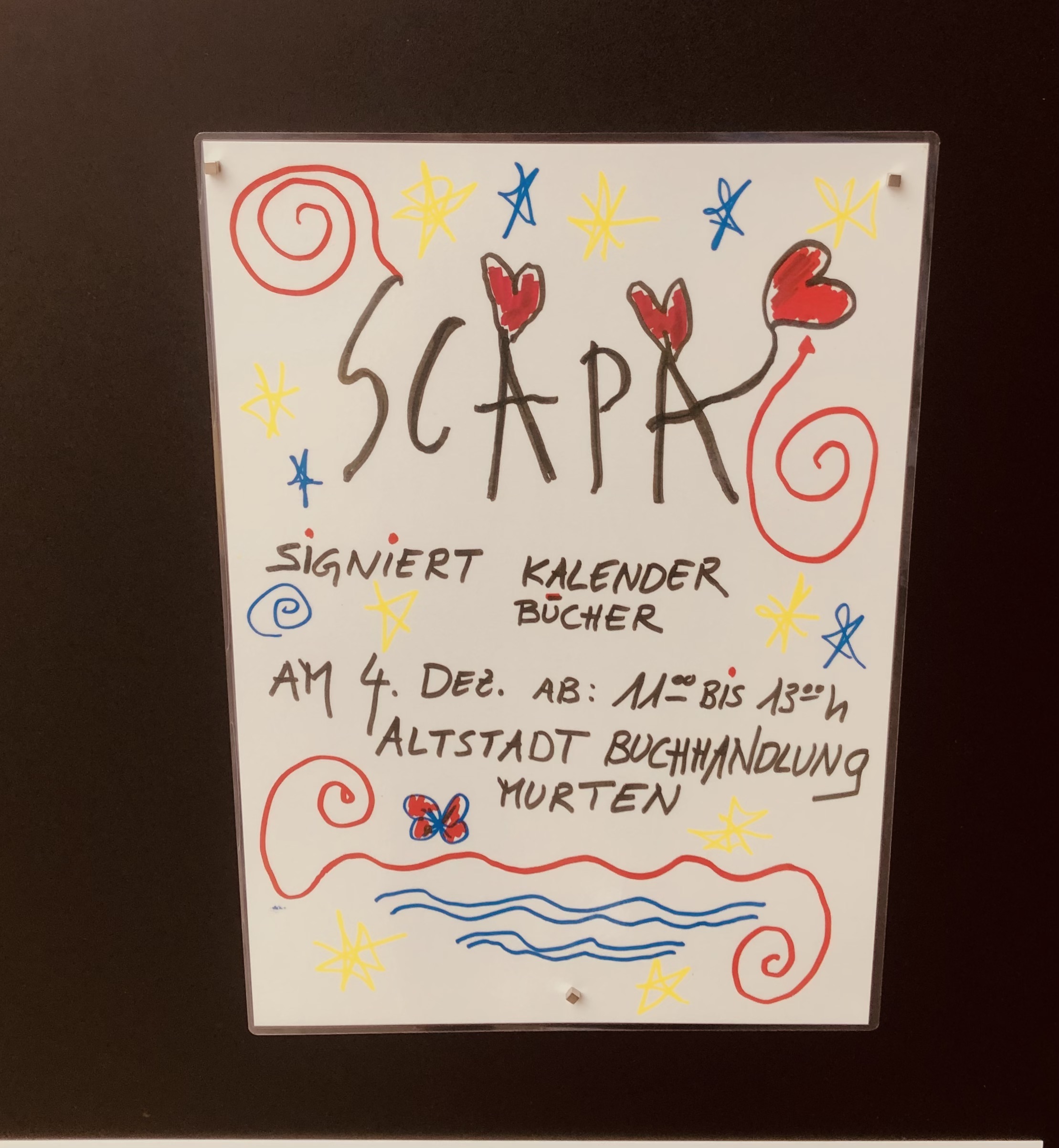 Ted Scapa signiert seit Jahrzehnten seine farbenfrohen Jahreskalender in der Buchhandlung im Stedtli und nun macht er das exklusiv in Murten: Alle seine Fans sind glücklich, dass Ted Scapa in all den vielen Jahren und 'dank' seines hohen Alters diesen traditionellen Anlass hier bei uns weiterleben lässt.