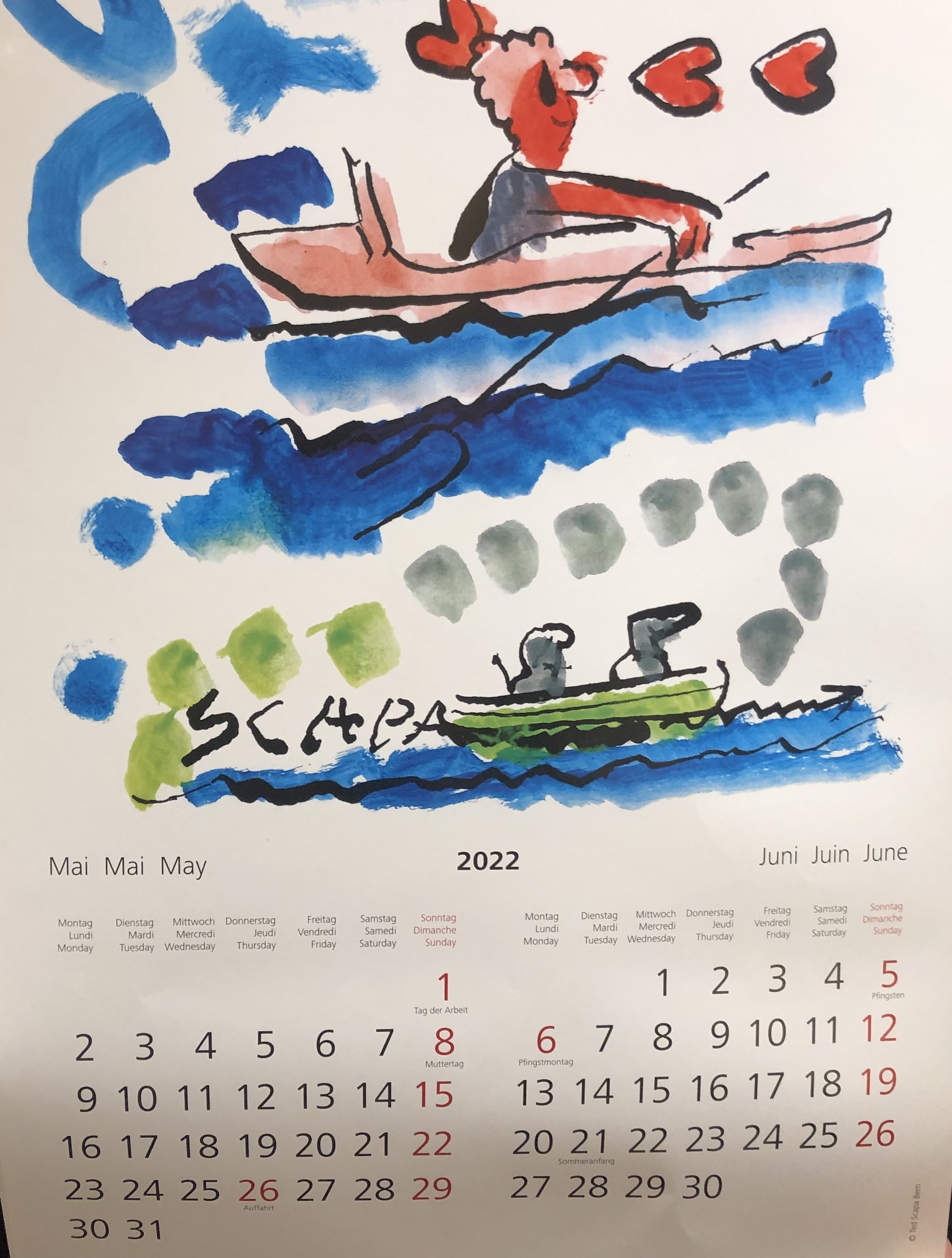 Am Samstag, 4. Dezember 2021 signiert Ted Scapa in der Altstadt Buchhandlung seine farbigen Jahreskalender, wovon jeder ein Einzelstück ist. Die Ausgabe 2022 ist eben erschienen und in der Altstadtbuchhandlung Murten erhältlich. Eine lieb gewonnene Tradition, die jeden Monat eines neuen Jahres als kleines Kunstwerk darstellt.