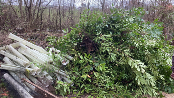 Es ging darum, in der Region Altavilla/Murtenholz Draht- und Plastikkörbe von den Bäumen zu entfernen. Diese werden bei der Pflanzung von Bäumen als Schutz vor Verbissen von Wildtieren angebracht und können wieder entfernt werden, wenn der Baum eine gewisse Grösse erreicht hat. Die zweite, etwas schweisstreibendere Aufgabe war das Entfernen von Neophyten, die sich in dieser Waldregion besonders vermehrt haben - insbesondere der Kirschlorbeer und der Sommerflieder. Neophyten sind nicht-einheimische Pflanzen, welche durch illegale Grüngutdeponien oder durch Vögel (welche die Beeren essen und anschliessend die Samen ausscheiden) verbreitet werden und sich invasiv in der Natur ausbreiten. Das Problem liegt darin, dass sie einheimische Pflanzen ernsthaft in Bedrängnis, oder sogar gänzlich ausrotten können und dadurch zu einem ökologischen Problem werden, wenn sie nicht regelmässig aus der Natur entfernt werden. Also wurde zu Schaufel, Pickel, Seilen und Hacken gegriffen, um den Neophyten zu Leibe zu rücken. Eine recht ansprengende Arbeit, die dazu führte, dass trotz Wind und Regen niemand frieren musste! In Zusammenarbeit mit dem Forst „Galm Murtensee“ werden die gesammelten Neophytenhaufen fachgerecht entsorgt und die Kirschlorbeeren, welche mittlerweile zu gross geworden sind um sie von Hand zu entfernen, mit der Seilwinde aus dem Wald gezogen.