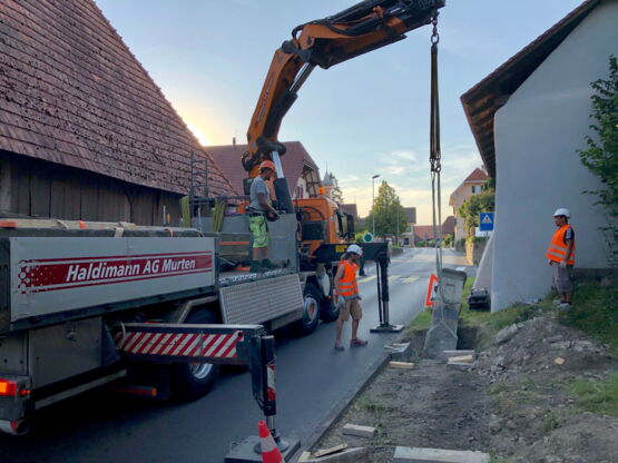 Nun konnte der Brunntrog mitsamt Brunnstock am Abend des 20. Juli 2023 durch einen Spezialtransporter der Firma Haldimann abtransportiert werden. Der Abtransport hat dabei nur knappe 20 Minuten gedauert.