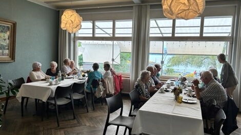 Anschliessend führte die Gruppe ihre Reise zum Hotel Bad Murtensee fort, wo sie herzlich mit duftendem Kaffee, frischem Kuchen und «lüpfiger» Musik eines dreiköpfigen Handörgeli-Trios empfangen wurden. Die Senior*innen blieben bis zum späten Nachmittag im Hof oder im Saal des Restaurants und genossen den Austausch.