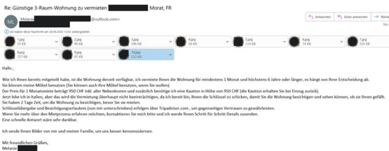 Interessenten, die auf die gefälschten Inserate reagieren, erhalten in der Regel holprig formulierte E-Mails. Darin erzählen die Kriminellen eine immer ähnliche Geschichte: die angeblichen Eigentümer leben im Ausland und hatten die Wohnung für ihre Tochter gekauft, die in der Schweiz studiert hat. Oder die Wohnung wurde für die Familie gekauft, man habe 10 Jahre in der Schweiz gewohnt. Nun sei man zurück im Ausland und die Wohnung stehe zur Verfügung, entweder möbliert oder unmöbliert.