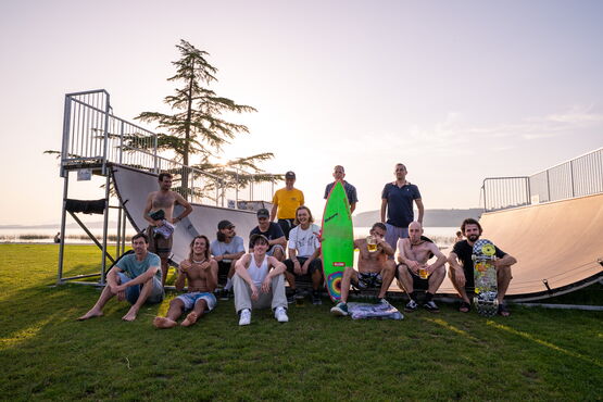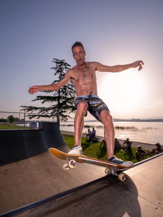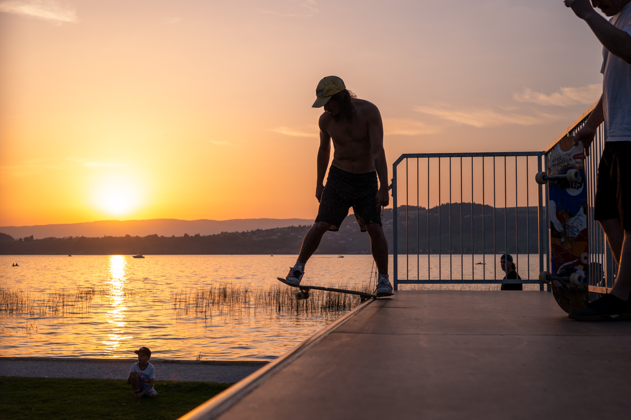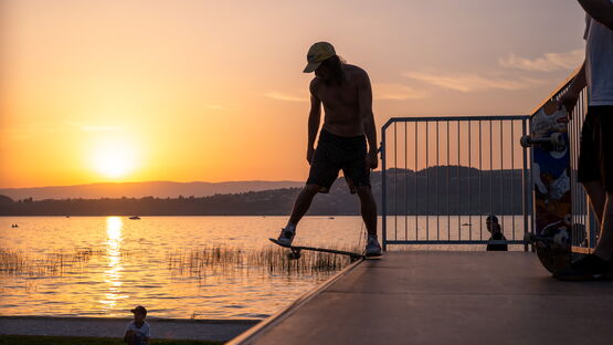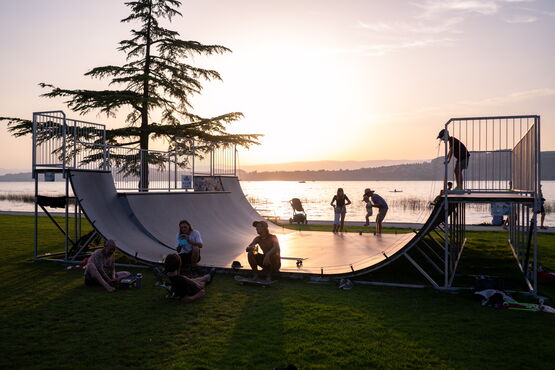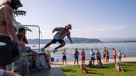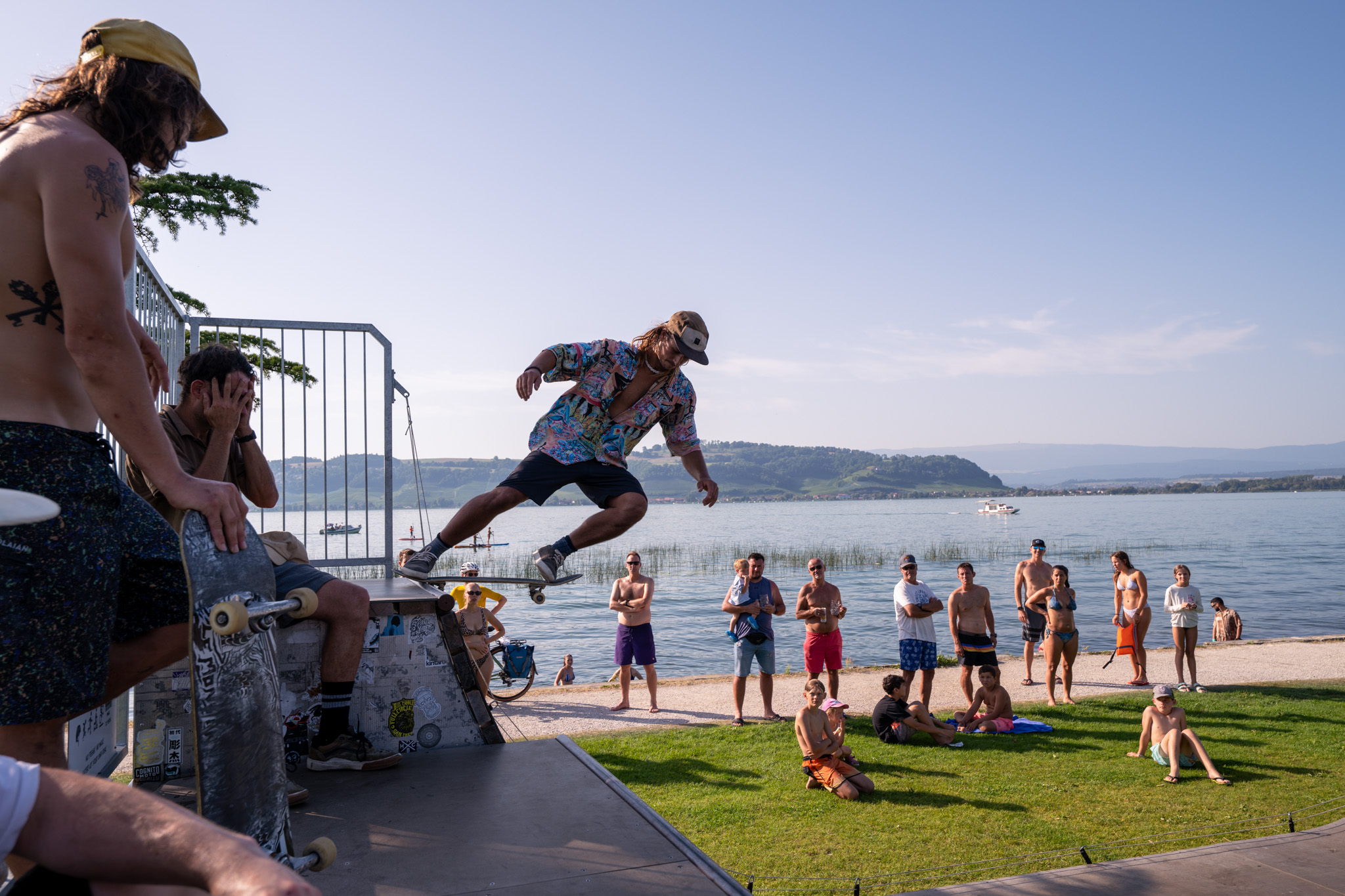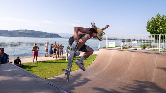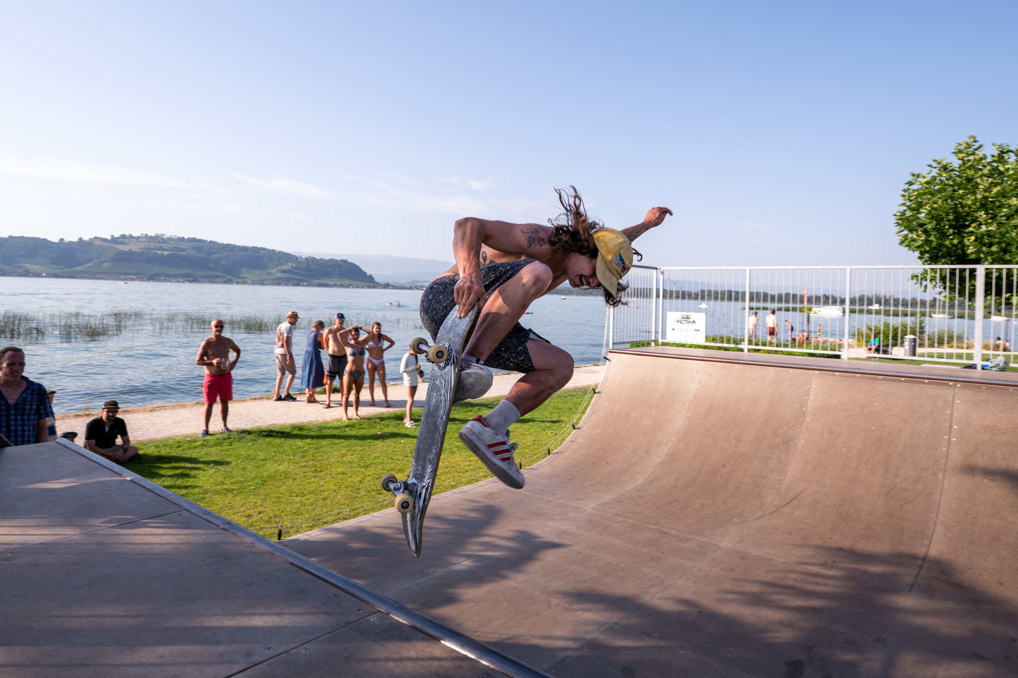 Skaten an der Pantschau Murten: Gute Stimmung, lachende Gesichter, mitreissende Musik, eine erfrischende Abkühlung im Wasser und fliegende Bretter – purer Fun am See!