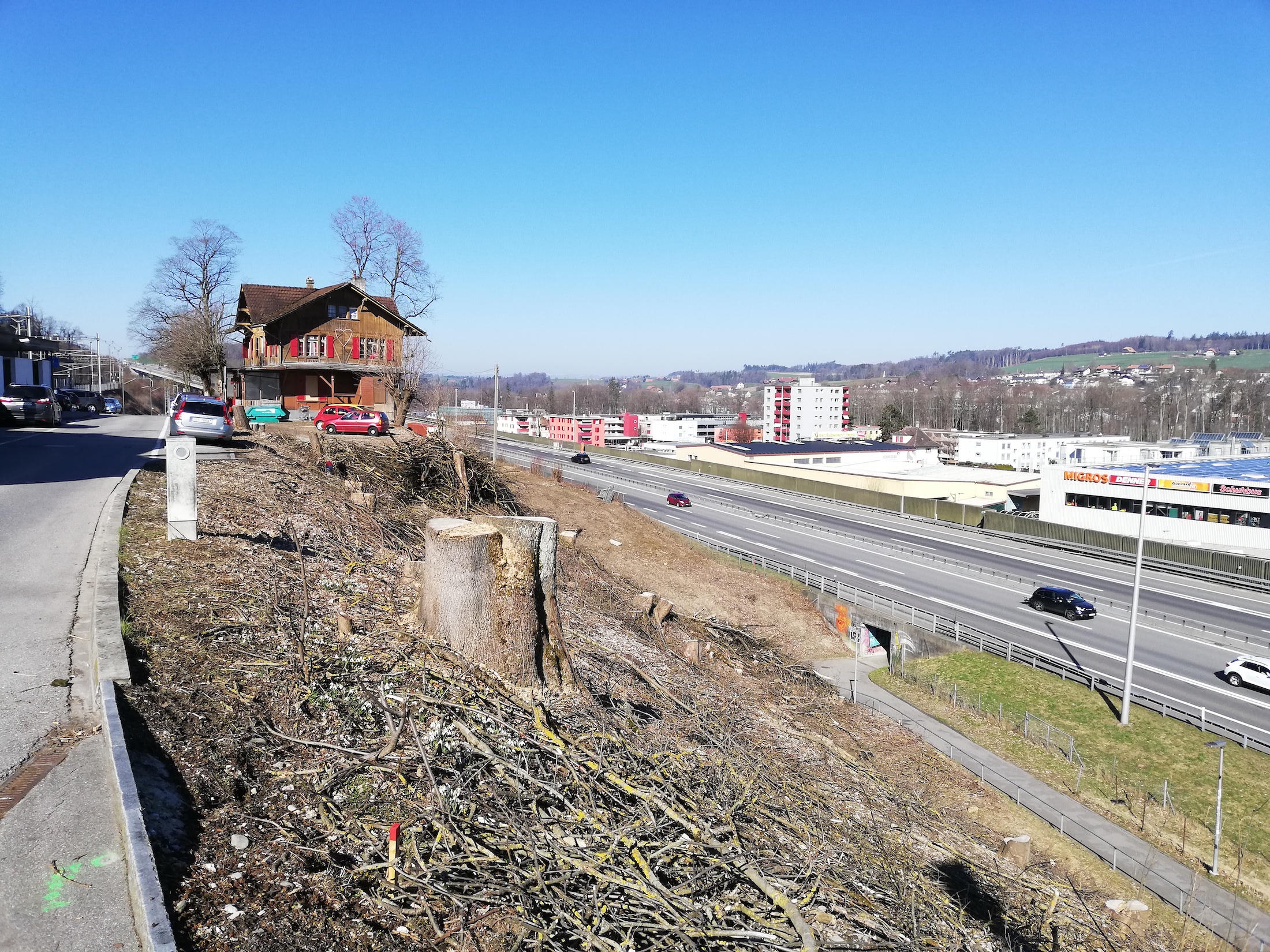 Grossflächige Abholzungen wie an der Nordseite des Mont Vully, entlang der Sense in Laupen und in Flamatt (siehe Fotos unten) wirken sich kontraproduktiv auf die CO2-Entlastung aus. Laut einer ETH-Studie (Wie Bäume das Klima retten könnten) müssten nämlich Bäume von der Fläche der USA angepflanzt werden, damit der Klimawandel gebremst werden kann.